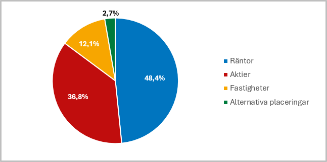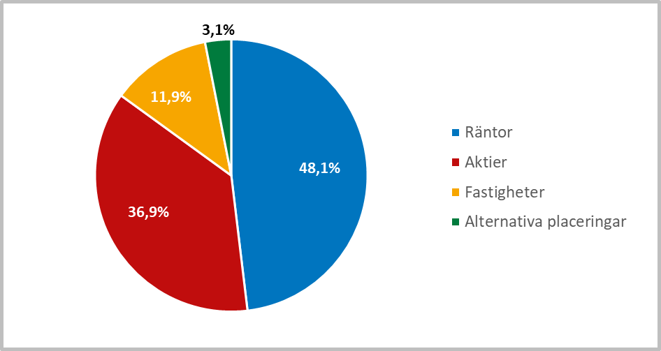 Placeringsstrategin utgår från den långsiktigt förväntade avkastningen hos de olika tillgångsslagen. Den strategiska allokeringen syftar till att uppnå målet genom god riskdiversifiering mellan utvalda tillgångsslag. Pensionsstiftelsens strategiska allokering återspeglar vid var tid den fördelning mellan tillgångsslagen aktier, räntor, fastigheter och alternativa placeringar som möjliggör att det reala avkastningsmålet förväntas uppnås.